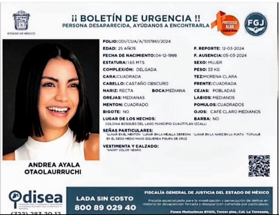 Cancún (Marcrix Noticias).- Andrea Ayala Otaolaurruchi, del Estado de México, fue declarada oficialmente desaparecida el pasado 5 de marzo y se presume que pueda estar privada de su libertad y su vida esté en peligro.