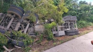 Mérida (Marcrix Noticias).- Una pipa de doble remolque terminó volcada en el tramo de Sisbichén- Chemax kilómetro 182 de la autopista Cancún a Mérida, derramando turbosina en el lugar.