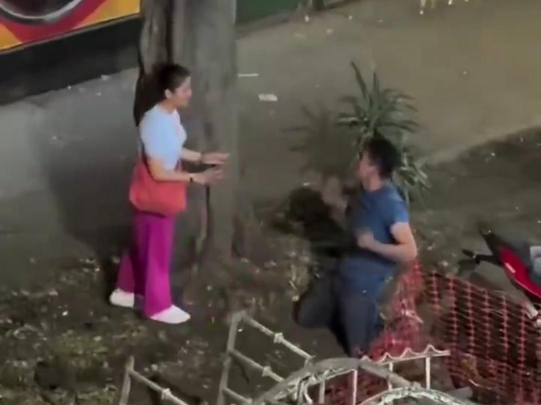 En el video viral, el hombre aparece arrodillado, negándose a levantarse y protagonizando un berrinche que rápidamente llamó la atención de quienes pasaban por el lugar. Mientras tanto, la mujer, visiblemente incómoda, primero intenta retirarse, pero luego regresa para tratar de levantarlo ante la mirada de curiosos.