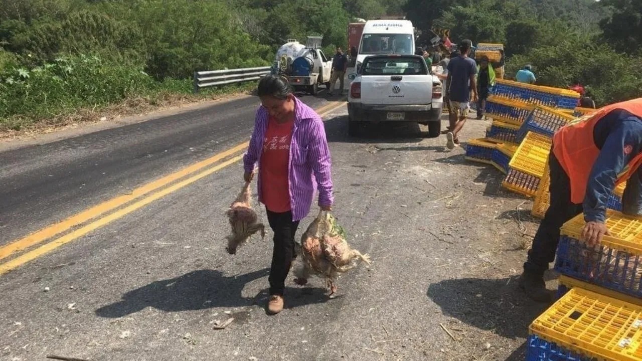 Un accidente en Veracruz deja un camión volcado y pollos vivos rapiñados por pobladores.