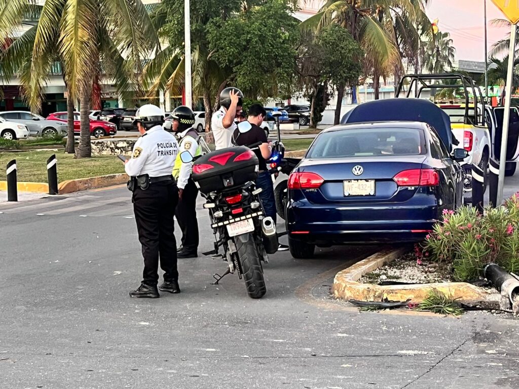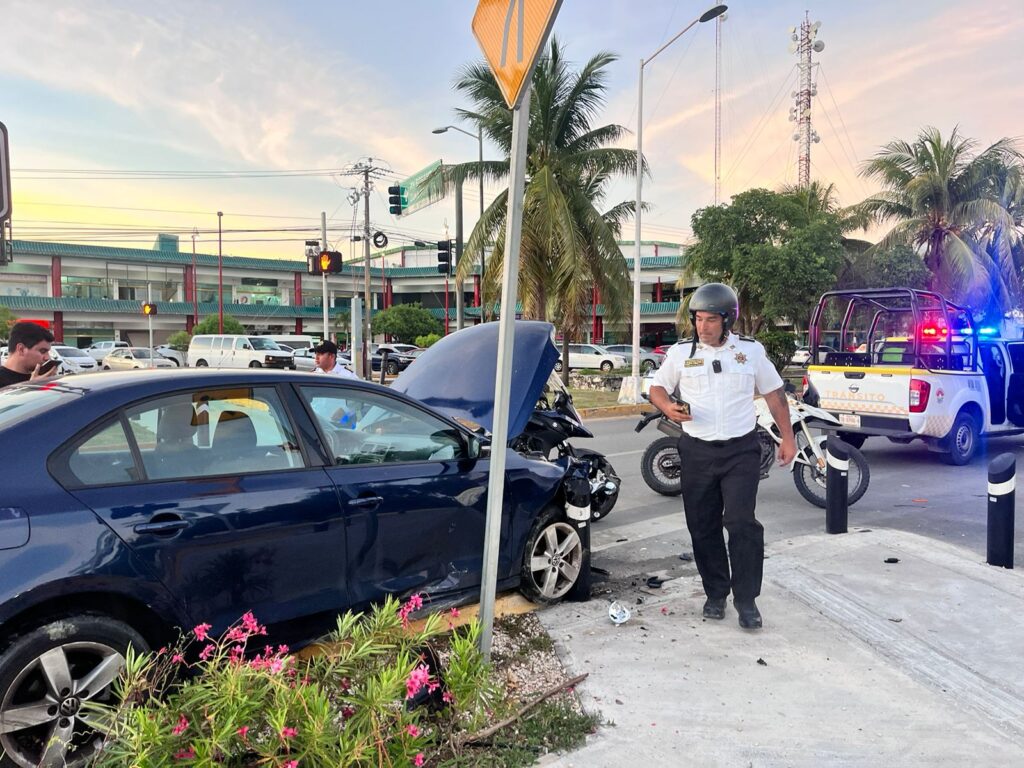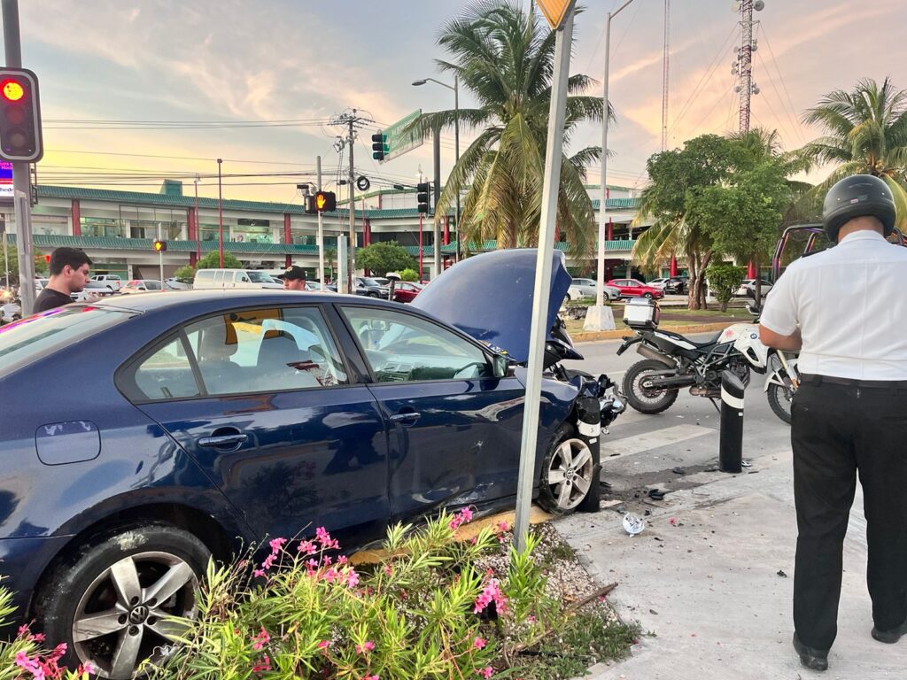 El accidente ocurrió justo cuando el conductor del Volkswagen tipo Jetta transitaba sobre la avenida Tanká y al llegar al cruzamiento con la avenida Xcaret, cruzaba en preferencia cuando el motociclista que circulaba sobre la Xcaret se pasa el alto y al tratar de evadirlo, termina con su Jetta sobre el camellón e impactado en el murete de concreto.