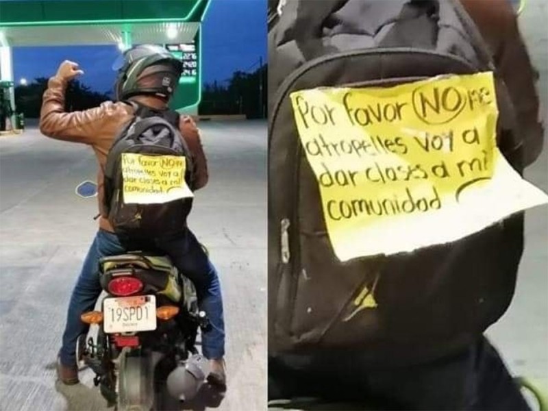 CIUDAD DE MEXICO (MARCRIX NOTICIAS) A través de redes sociales se viralizó una imagen en la que aparece un maestro a bordo de su moto con una hoja pegada en la espalda, en la que se puede leer un mensaje donde pide que no lo atropellen.