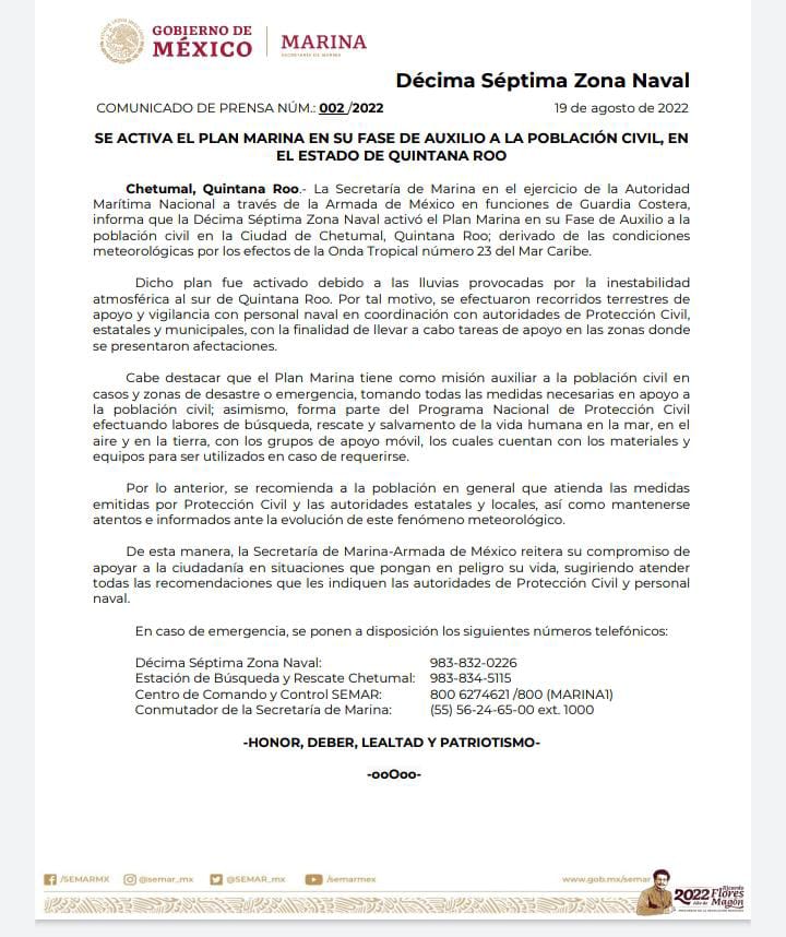 Chetumal (Marcrix Noticias).- La Secretaría de Marina en el ejercicio de la Autoridad Marítima Nacional a través de la Armada de México en funciones de Guardia Costera, informa que la Décima Séptima Zona Naval activó el Plan Marina en su Fase de Auxilio a la población civil en la Ciudad de Chetumal, Quintana Roo; derivado de las condiciones meteorológicas por los efectos de la Onda Tropical número 23 del Mar Caribe.