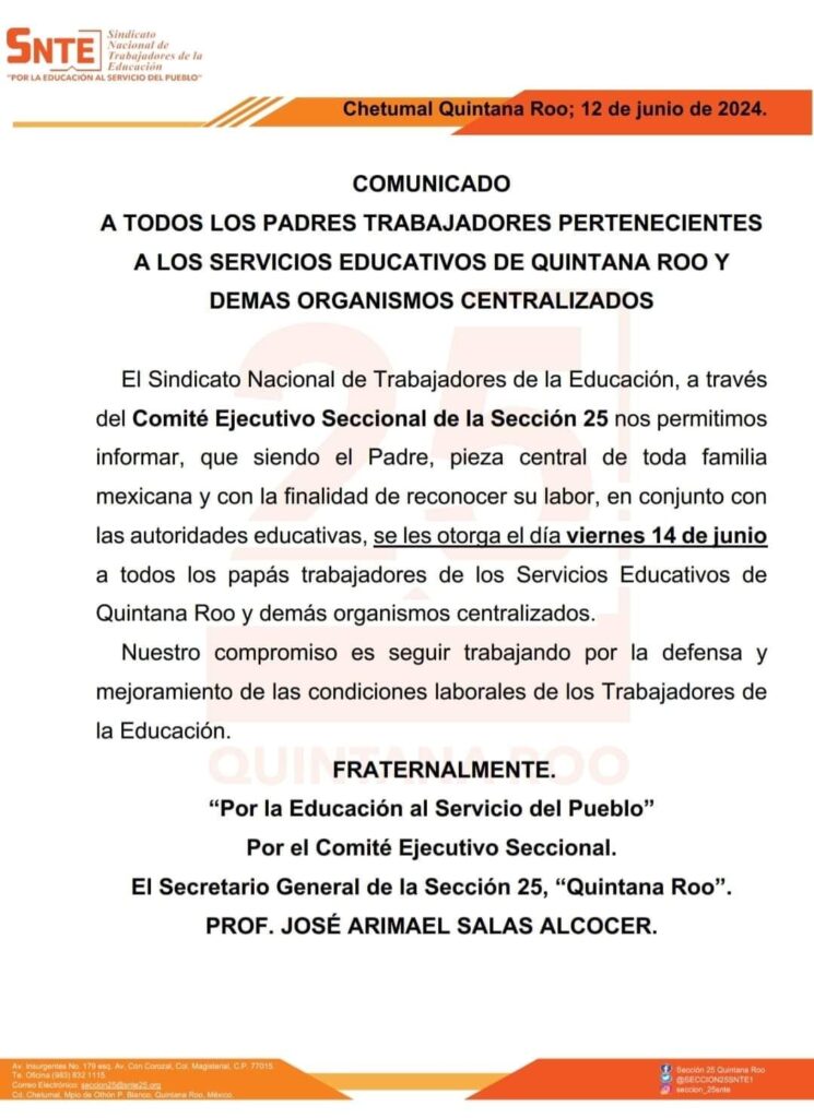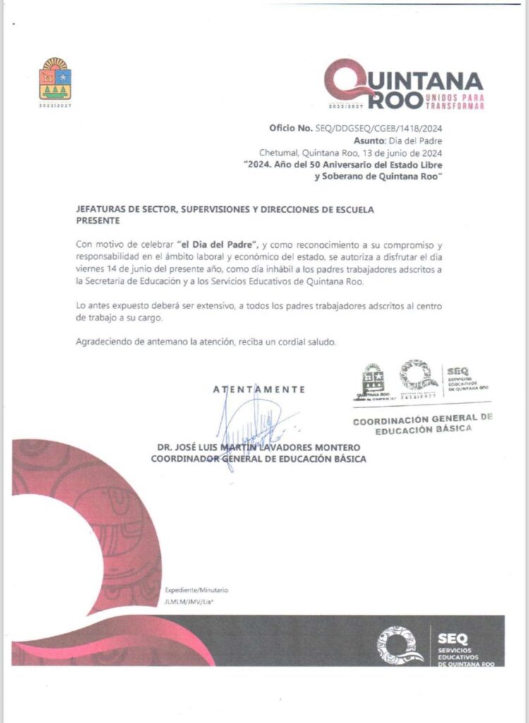 A través de una circular, los Servicios Educativos de Quintana Roo (SEQ) notificó a supervisores, directores, jefes de sector y coordinadores y directivos, que en razón de equidad de género, se les otorgaba un día hábil para que los maestros y trabajadores de la educación que son papás, pudieran gozar de un día de asueto.