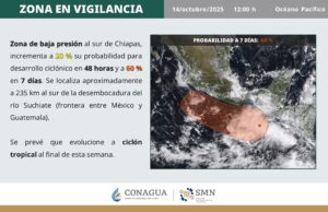 Una zona de baja presión al sur de Chiapas podría evolucionar en la tormenta tropical “Sonia” en los próximos días. La Conagua mantiene seguimiento constante y recomienda a la población extremar precauciones