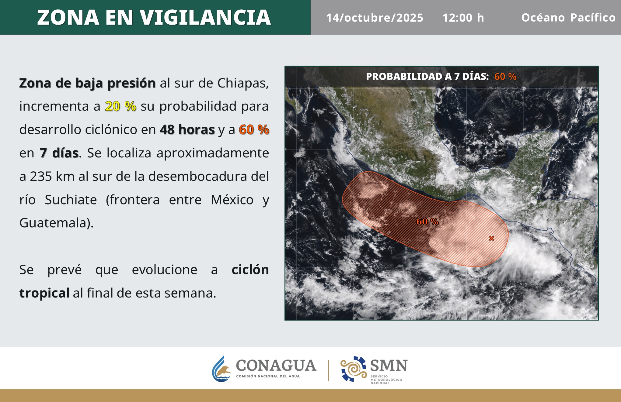 El fenómeno se localiza aproximadamente a 235 kilómetros al sur de la desembocadura del río Suchiate, en la frontera entre México y Guatemala. Conagua mantiene vigilancia constante y recomienda a la población mantenerse atenta a los avisos oficiales.