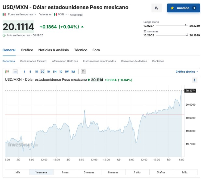México (Marcrix Noticias).- El peso mexicano ha retrocedido nuevamente en la sesión de hoy, jueves 5 de septiembre de 2024, alcanzando un precio del dólar que supera los 20 pesos.