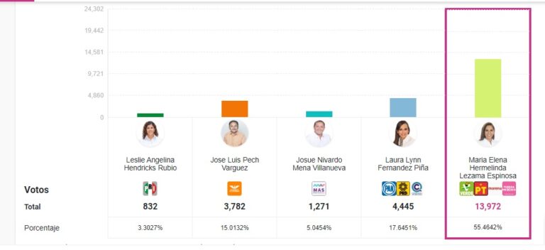 El Programa de Resultados Preliminares (PREP) del Instituto Electoral de Quintana Roo (Ieqroo) da al corte de las 9 de la noche, una amplia ventaja a a Mara Lezama de la alianza “Juntos hacemos Historia por Quintana Roo” para la gubernatura del estado.