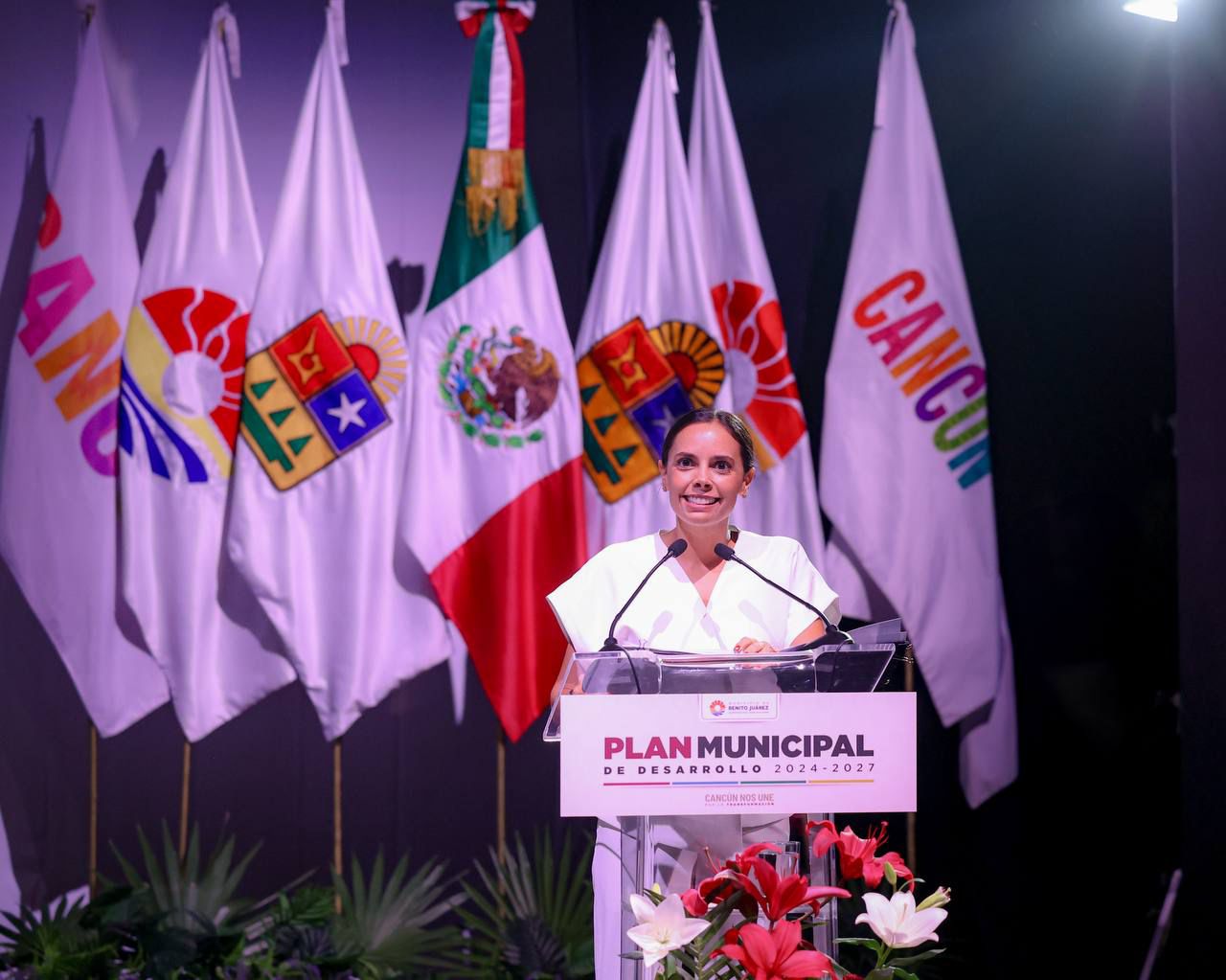 Cancún, Q. R., a 18 de junio de 2025.- Para consolidar un Cancún más justo, humano y ordenado, donde se refleje el segundo piso de la Cuarta Transformación, la Presidenta Municipal, Ana Paty Peralta, presentó de manera clara y estructurada a través de un material audiovisual, el Plan Municipal de Desarrollo (PMD) 2024-2027, que contempla 4 objetivos estratégicos, 23 objetivos, 76 estrategias, 230 líneas de acción, 331 indicadores, 331 metas, 13 proyectos estratégicos y 25 programas, los cuales están alineados al Plan Estatal y al Plan Nacional de Desarrollo.