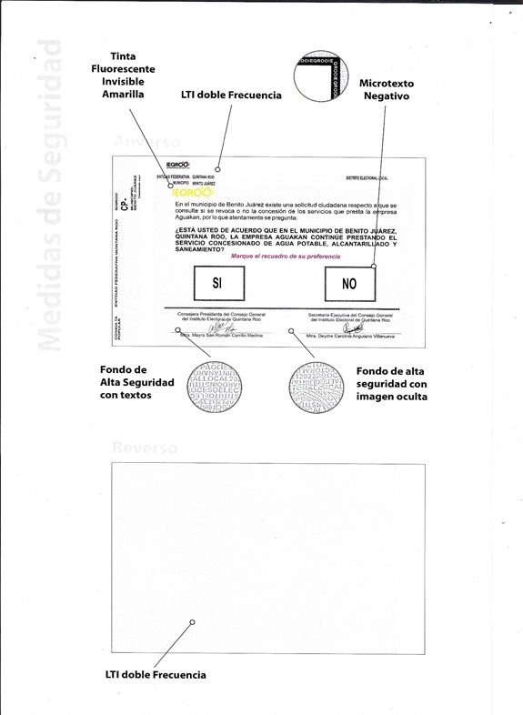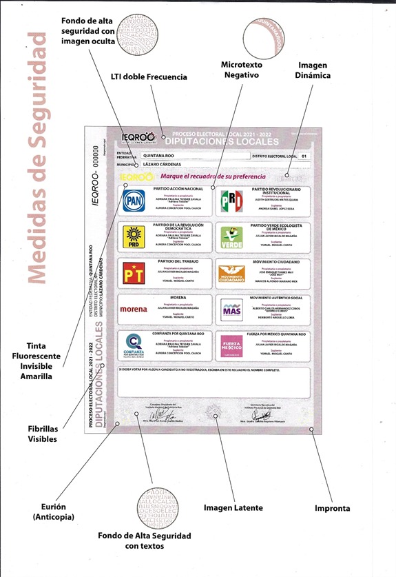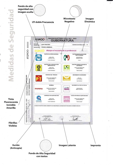 El marco del recuadro blanco del municipio del frente de la boleta cuenta con micro impresión con el texto “INSTITUTO ELECTORAL DE QUINTANA ROO” en letras blancas. Para verificarlo es necesario el uso de la lupa cuenta hilos.