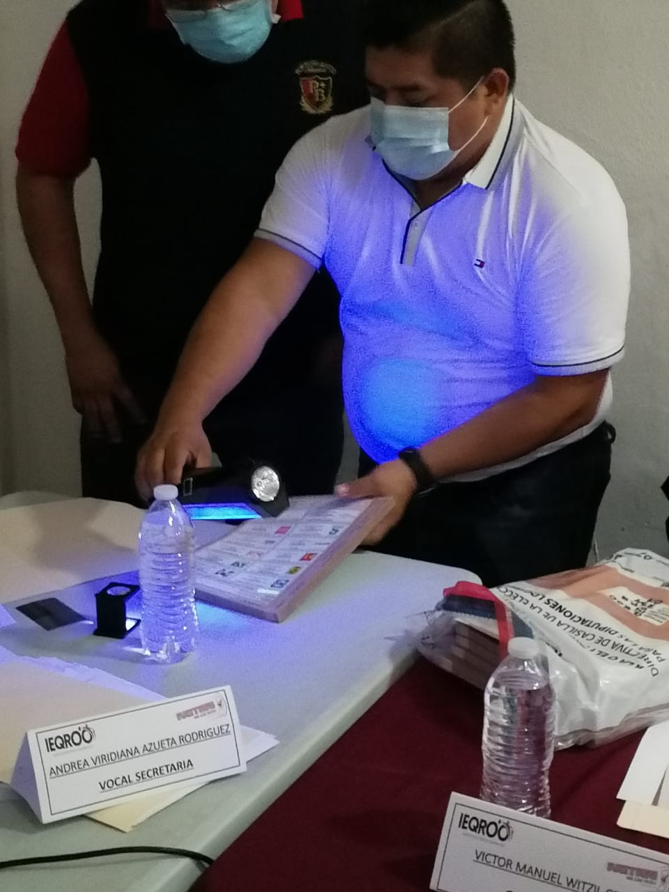 En la parte superior izquierda de la boleta, se encuentra impreso con una tinta que no es visible directamente, el emblema del IEQROO. Para poder visualizarlo es necesario utilizar la lámpara de luz ultra violeta la cual deberá encenderse y colocarse cerca de esta área sobre la boleta.
