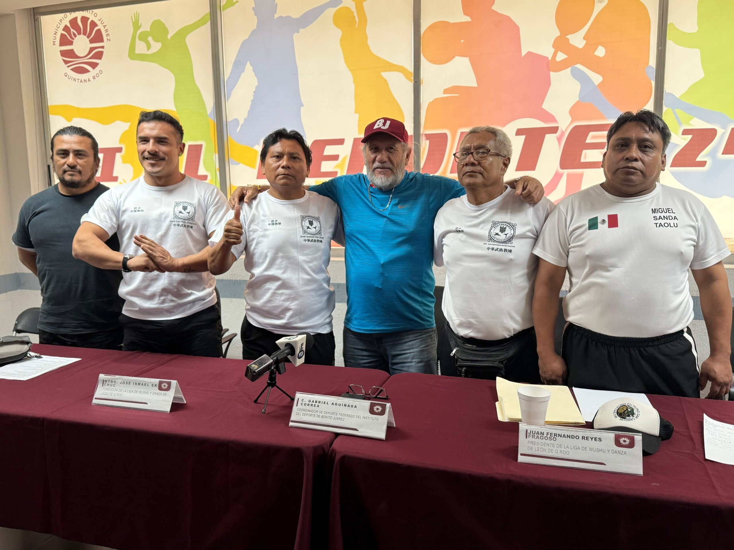 cancún (Marcrix Noticias)-Con el objetivo de certificar a maestros de artes marciales en Quintana Roo presentaron la Liga de Wushu y Danza de León de Quintana Roo, así lo dieron a conocer en conferencia de prensa; Juan Fernando Reyes Fragoso, presidente de la Liga; José Garibay Jiménez y José Ismael Ek Chuc, fundadores; así como Miguel Ángel Jiménez Can, integrante de la Liga de Wushu y Danza de León de Quintana Roo acompañados de Gabriel Aguiñaga, Coordinador de Deporte Federado del Instituto del Deporte de Benito Juárez.