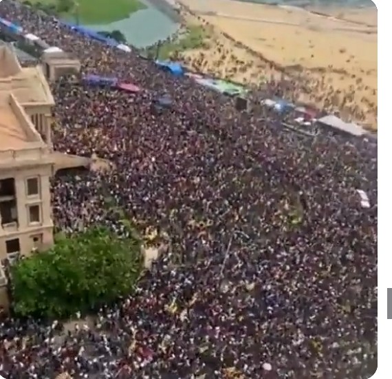 En la mayor protesta hasta la fecha en Sri Lanka, miles de personas rompieron barricadas y entraron en la residencia del presidente Rajapaksa y su oficina cercana. No estaba claro si Rajapaksa se encontraba en su residencia de Colombo cuando la muchedumbre la tomó por asalto. Un portavoz del gobierno, Mohan Samaranayake, dijo que no tenía información sobre su ubicación.