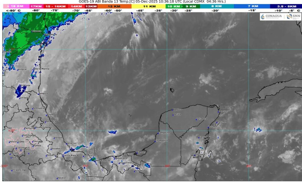 Este viernes 5 de diciembre, el clima en Quintana Roo estará marcado por la afluencia de humedad del mar Caribe, lo que provocará cielo parcialmente nublado, lluvias aisladas y chubascos intermitentes, además de un ambiente caluroso en la mayor parte del estado, con sensaciones térmicas superiores a los 35 grados.