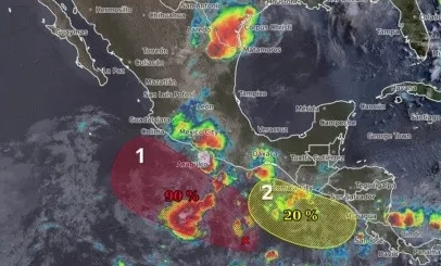 La primera es una zona de baja presión al sur de Oaxaca, que ha incrementado a 30% su probabilidad para desarrollo ciclónico en 48 horas y mantiene 90% en 7 días.