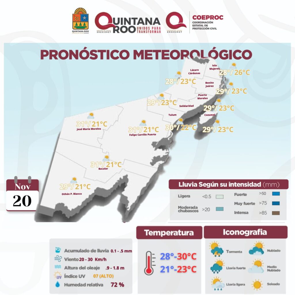 7.- JOSÉ MARÍA MORELOS.- parcialmente nublado, lluvias aisladas, caluroso, viento del este de 15 a 25 km/h. Temperatura Máxima: 32/34 GC. Temperatura Mínima: 20/22 GC. Sensación Térmica: 38 GC. Presión Atmosférica: 1011 hPa. Salida del Sol: 07:07 h. Puesta del Sol: 18:16 h.