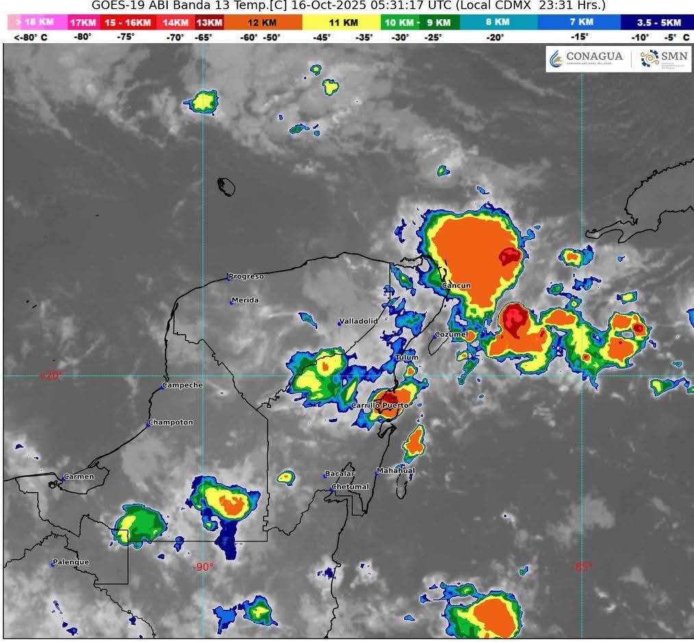 El organismo detalló que se prevé cielo medio nublado a nublado durante el día, con precipitaciones puntuales muy fuertes en el norte de Quintana Roo y el noreste de Yucatán, además de lluvias fuertes en el sur de Campeche. Estas condiciones podrían generar encharcamientos, inundaciones menores y disminución de la visibilidad en carreteras.