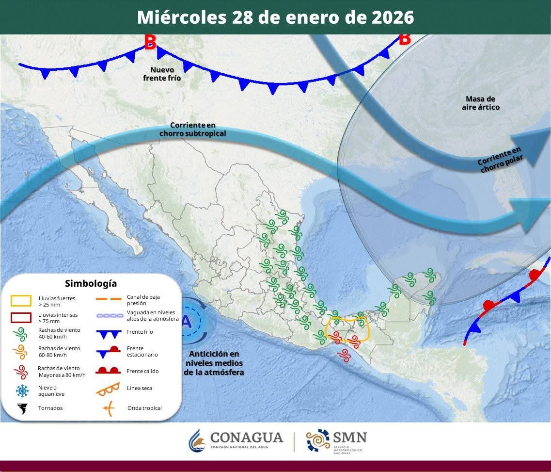Estas condiciones están asociadas a la masa de aire ártico que impulsó el frente frío número 30, la cual comenzará a modificar sus características térmicas, aunque continuará generando viento del Norte, oleaje elevado y bancos de niebla en regiones del Sureste del país.