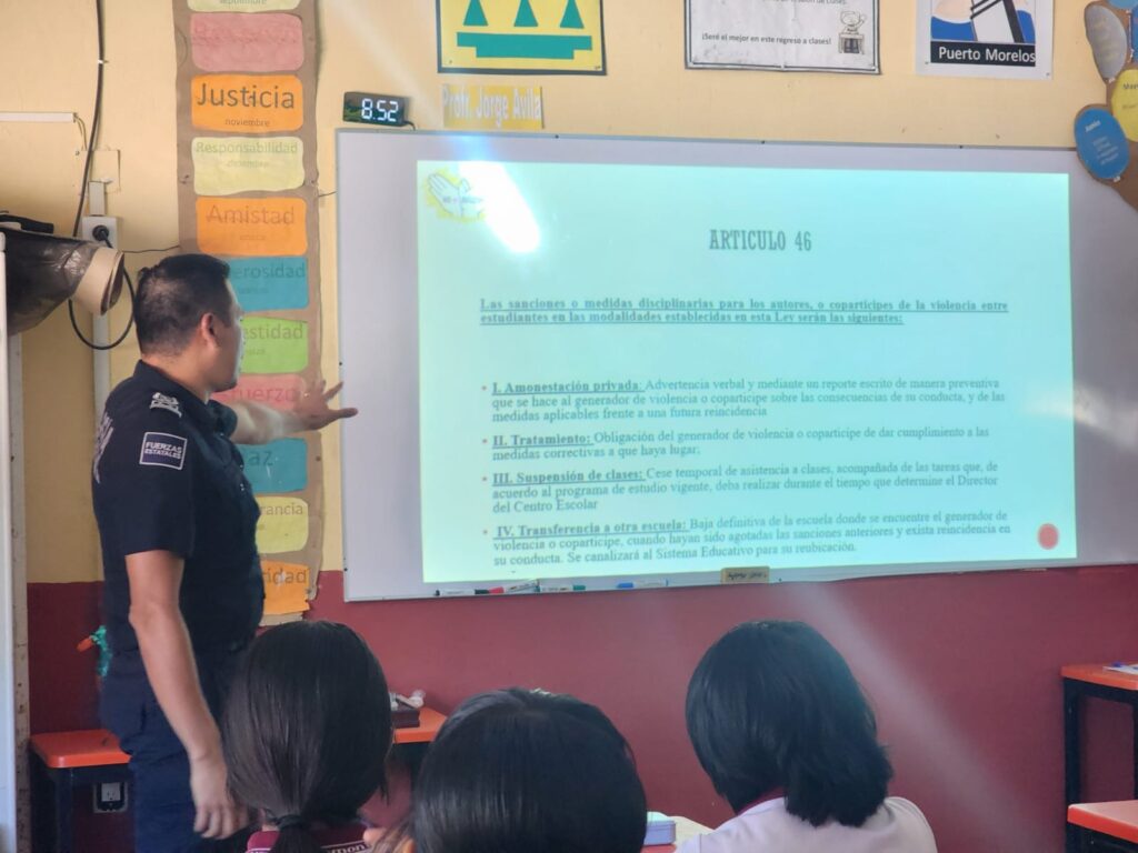 Puerto Morelos, Quintana Roo, (MARCRIX Noticias), 7 de noviembre de 2024.– En el marco del Día Internacional contra la Violencia y el Acoso Escolar, que se conmemora el primer jueves de noviembre, la Secretaría Municipal de Seguridad Ciudadana de Puerto Morelos, por conducto de la Dirección de Prevención del Delito y Participación Ciudadana, impartió pláticas a estudiantes de la Telesecundaria “Ramón Bravo Prieto” de la cabecera municipal.