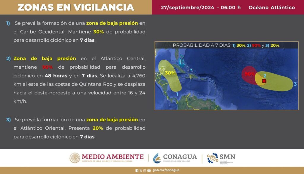 Además, la zona de baja presión en el Atlántico Central, mantiene 90% de probabilidad para desarrollo ciclónico en 48 horas y en 7 días.