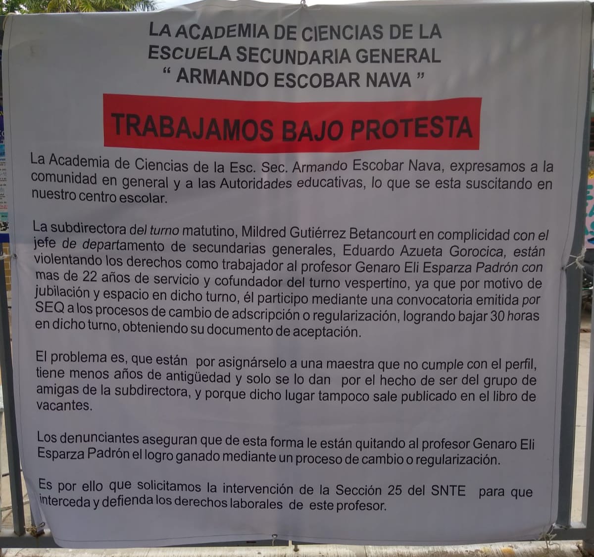 El profesor Genaro Eli Esparza Padrón y su academia han colocado una manta de protesta, denunciando la falta de intervención del personal de la SEQ y del Sindicato Nacional de Trabajadores de la Educación (SNTE) Sección 25 para que se resuelva este conflicto, le otorguen sus horas y espacio laboral al citado profesor, que ganó en la respectiva convocatoria y trabaje en la secundaria Armando Escobar Nava.