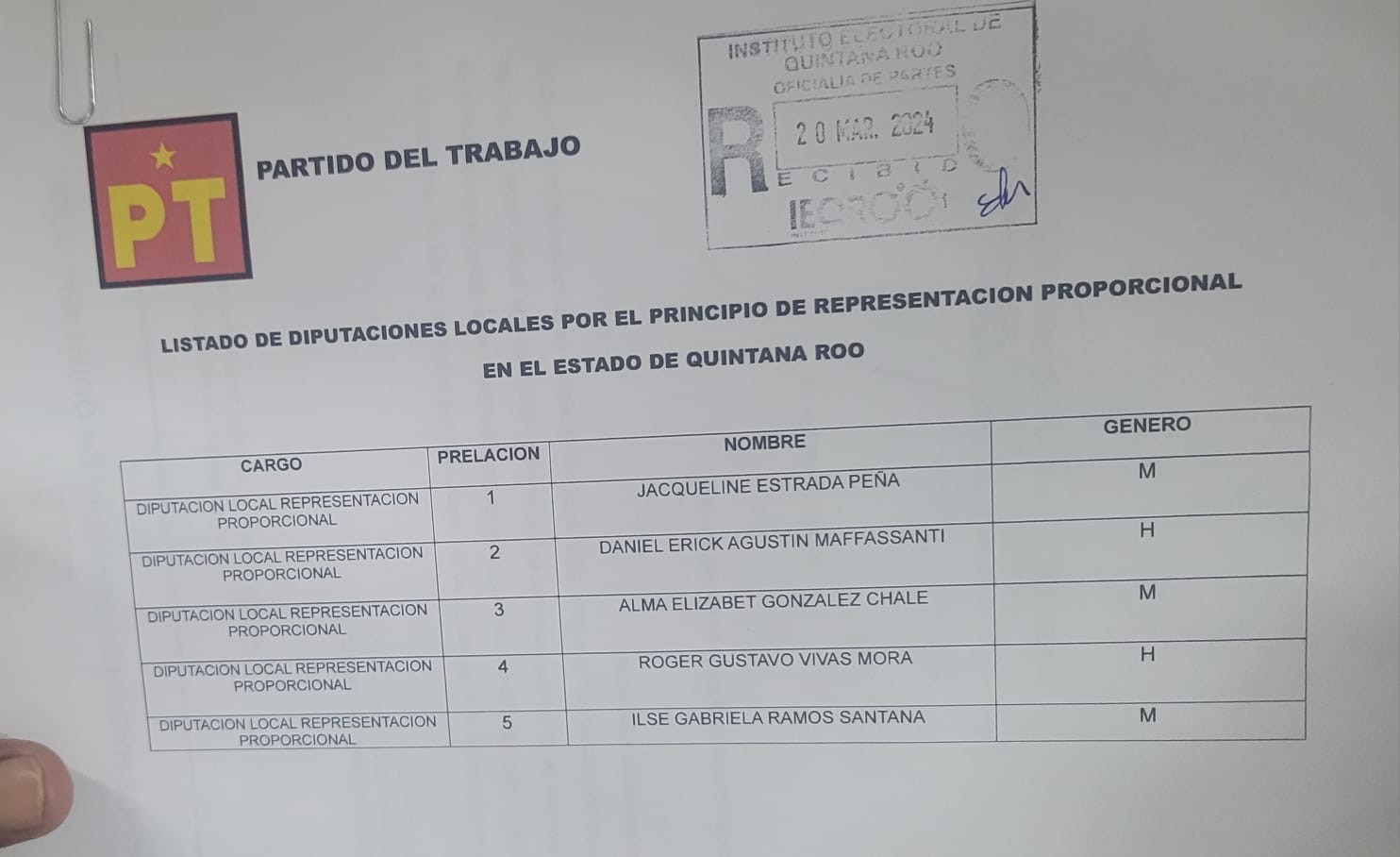 El PT, tal y como dijo Vera Reyes ha cumplido con este requisito de ley y su lista de candidatos plurinominales quedó de la siguiente manera: en la primera posición, Jaqueline Estrada Peña, seguida de Daniel Erick Agustín Muffassanti en la segunda posición, mientras que Alma Elizabeth González Chale, ocupa el tercer sitio.