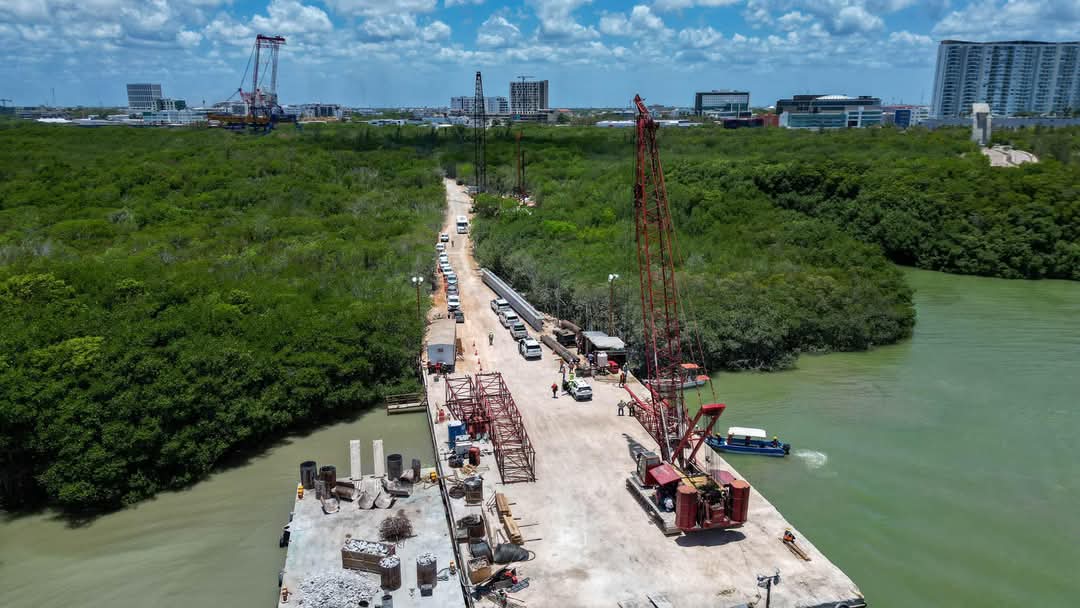 Este puente, que se extiende a lo largo de 8.8 kilómetros y contará con tres carriles, conectará la Zona Hotelera de Cancún con la ciudad, cruzando el Sistema Lagunar Nichupté.