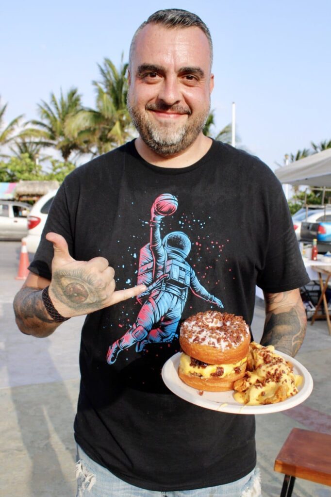 Jessica Ovalle y Javier Ovalle, de Don Mexkal, con la presentación de la hamburguesa-dona de nueva creación.