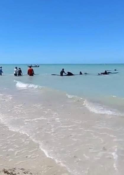 Aunque las ballenas piloto suelen habitar aguas oceánicas, también pueden ser avistadas en zonas costeras, como las de Yucatán, aunque está vez algo las perturbó que se desorientaron y quedaron varadas en la zona baja de la herradura.
