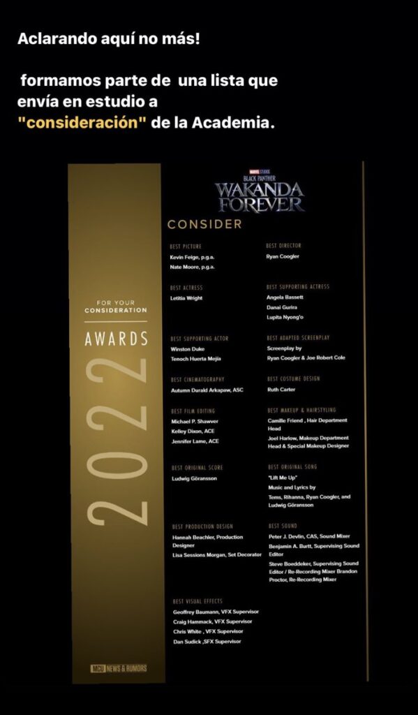 La lista solicita considerar a otros participantes de la película para nominaciones como Mejor Director a Ryan Coogler.