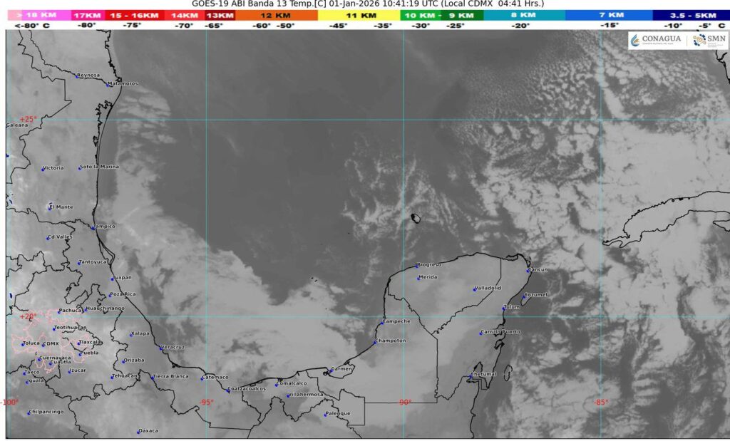 Cancún (Marcrix Noticias).– El primer día del 2026 inició en Quintana Roo con condiciones de cielo parcialmente nublado y poca probabilidad de lluvias, debido a un sistema de alta presión ubicado sobre el golfo de México que mantiene el ingreso de aire ártico modificado hacia la península de Yucatán.