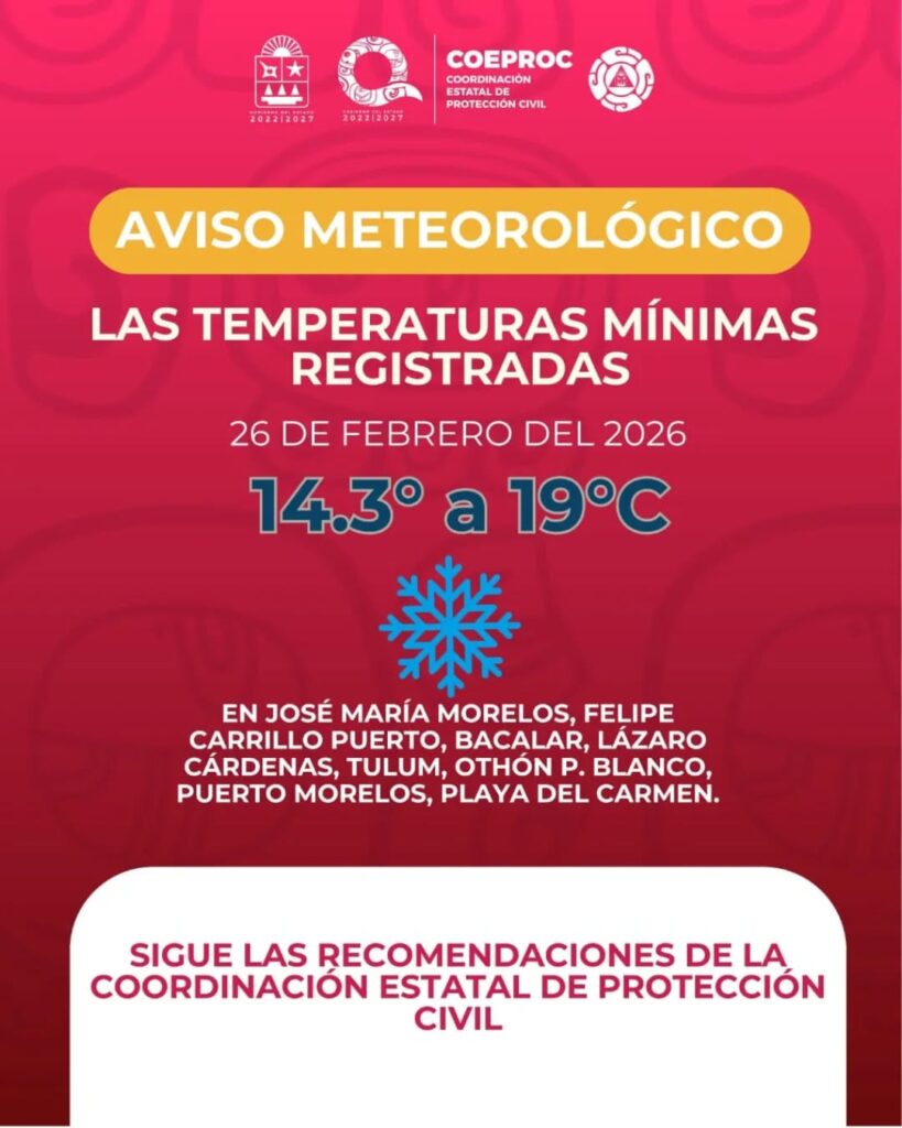 Chetumal (Marcrix Noticias).– La Coordinación Estatal de Protección Civil de Quintana Roo informó que este jueves 26 de febrero, se registraron temperaturas mínimas de entre 14.3 y 19 grados Celsius, en diversos municipios del estado, de acuerdo con el aviso meteorológico emitido con base en datos de estaciones de la Comisión Nacional del Agua.