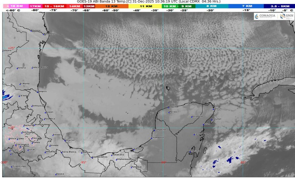 Cancún (Marcrix Noticias).– El último día de 2025 se despedirá con ambiente templado a fresco en Quintana Roo, debido a la influencia de la masa de aire ártico que impulsa al frente frío número 25, la cual provocará cielo medio nublado, lluvias con intervalos de chubascos, vientos del norte y noreste con rachas fuertes, así como oleaje elevado en zonas costeras, principalmente en el norte del estado.