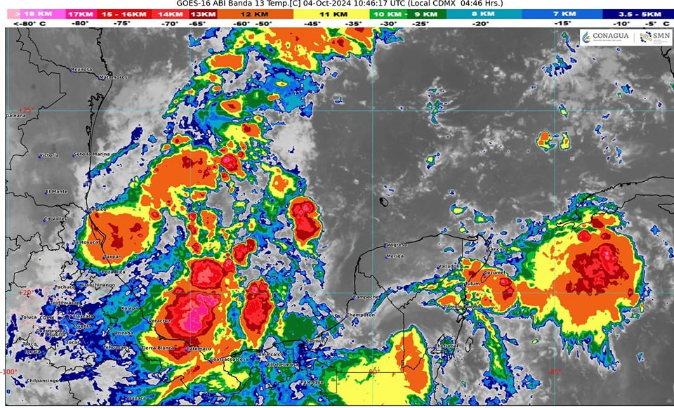 Benito Juárez (Cancún): Cielo nublado con lluvias muy fuertes y actividad eléctrica. Temperatura máxima de 33-35 °C y mínima de 24-26 °C. Vientos del sureste con rachas.