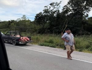 Yucatán (Marcrix Noticias).- Un tráiler que transportaba cochinos se volteó en la carretera federal Mérida a Izamal y vecinos de los alrededores aprovecharon para realizar la rapiña de cerdos que transportaban.