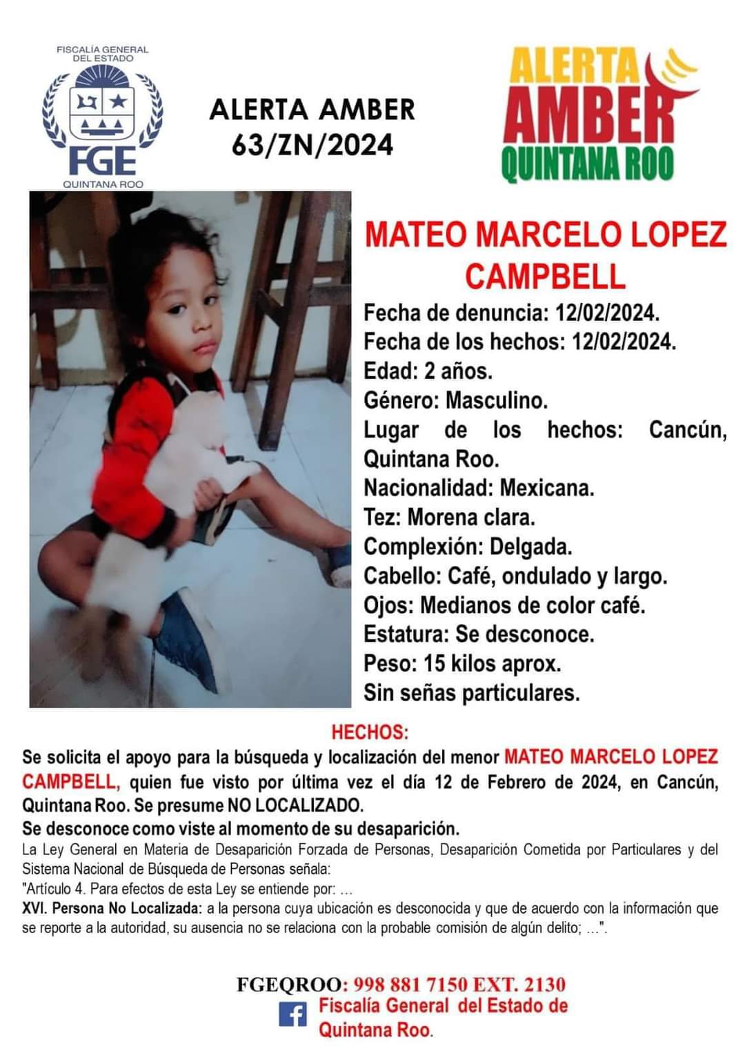 Tras el robo de un bebé de 2 años, la Fiscalía General del Estado de Quintana Roo activó la respectiva ficha de búsqueda Alerta Amber de Mateo Marcelo López Campbell, visto por última vez el 11 de febrero de 2024 en la ciudad de Cancún, en el municipio Benito Juárez.