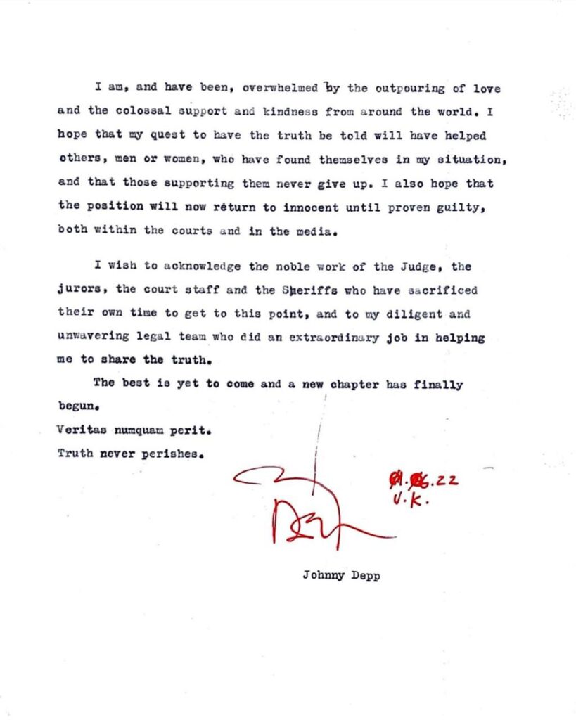 Ciudad de México (Marcrix Noticias).- Luego de que un jurado determinó que Amber Heard difamó a su exesposo Johnny Depp, el actor difundió un comunicado en el que afirmó que “la verdad persevera, nunca muere”.