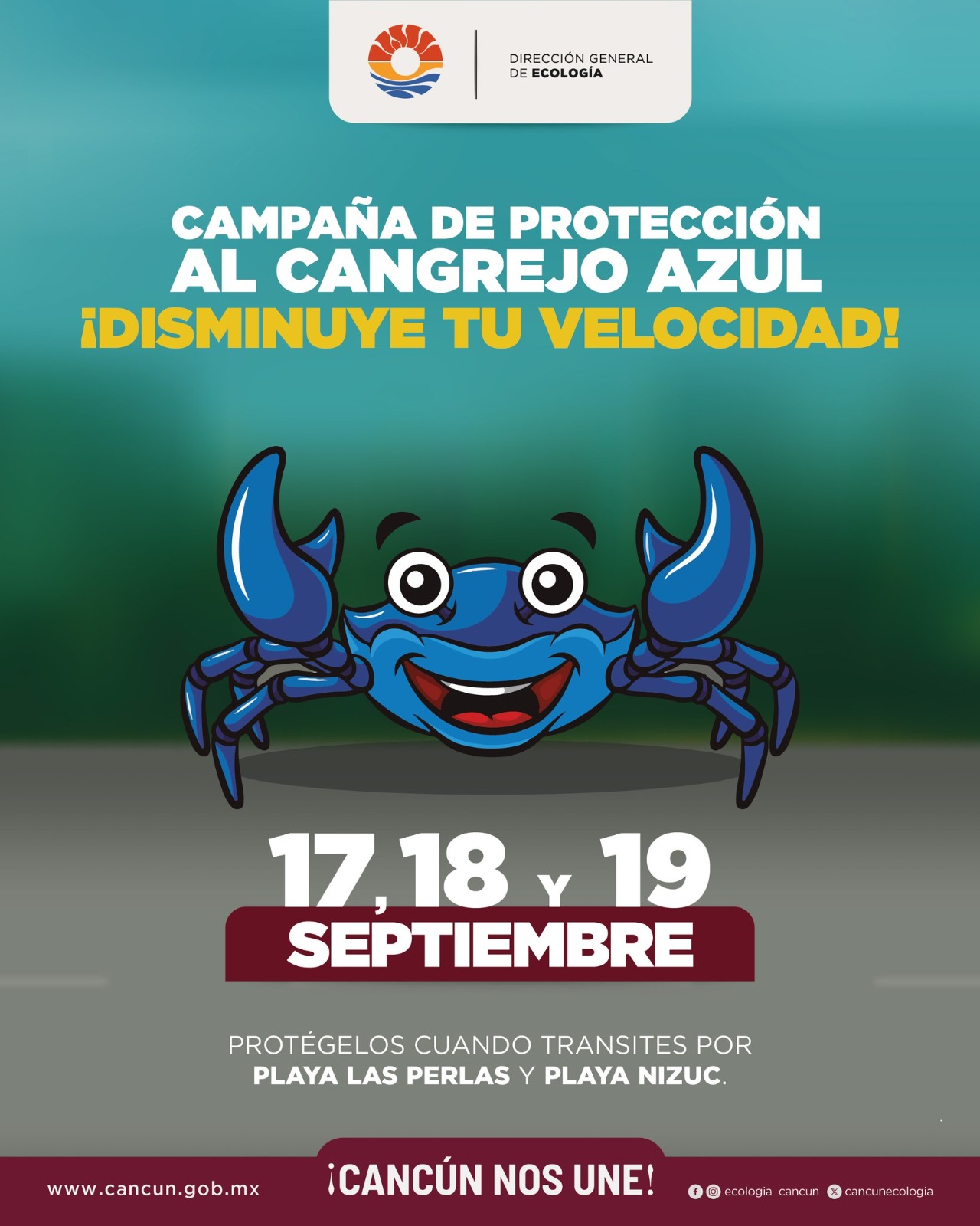 La titular de esta dirección, Tania Estefanía Fernández Moreno, informó que el ciclo reproductivo de los cangrejos azules está relacionado con el ciclo lunar y la temporada de lluvias entre los meses de septiembre y octubre, por ello, exhortó a la ciudadanía a que en las últimas semanas de estos dos meses, a partir de las 18:00 horas, los conductores disminuyan la velocidad al transitar a la altura de Playa Las Perlas y Playa Nizuc.