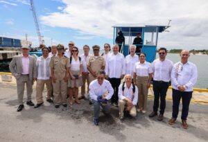 Posteriormente, los visitantes abordaron la barcaza sargacera BSC 210, a bordo de la cual realizaron un breve recorrido para conocer su funcionamiento, al igual que el de las barreras sargaceras instaladas en aguas someras.