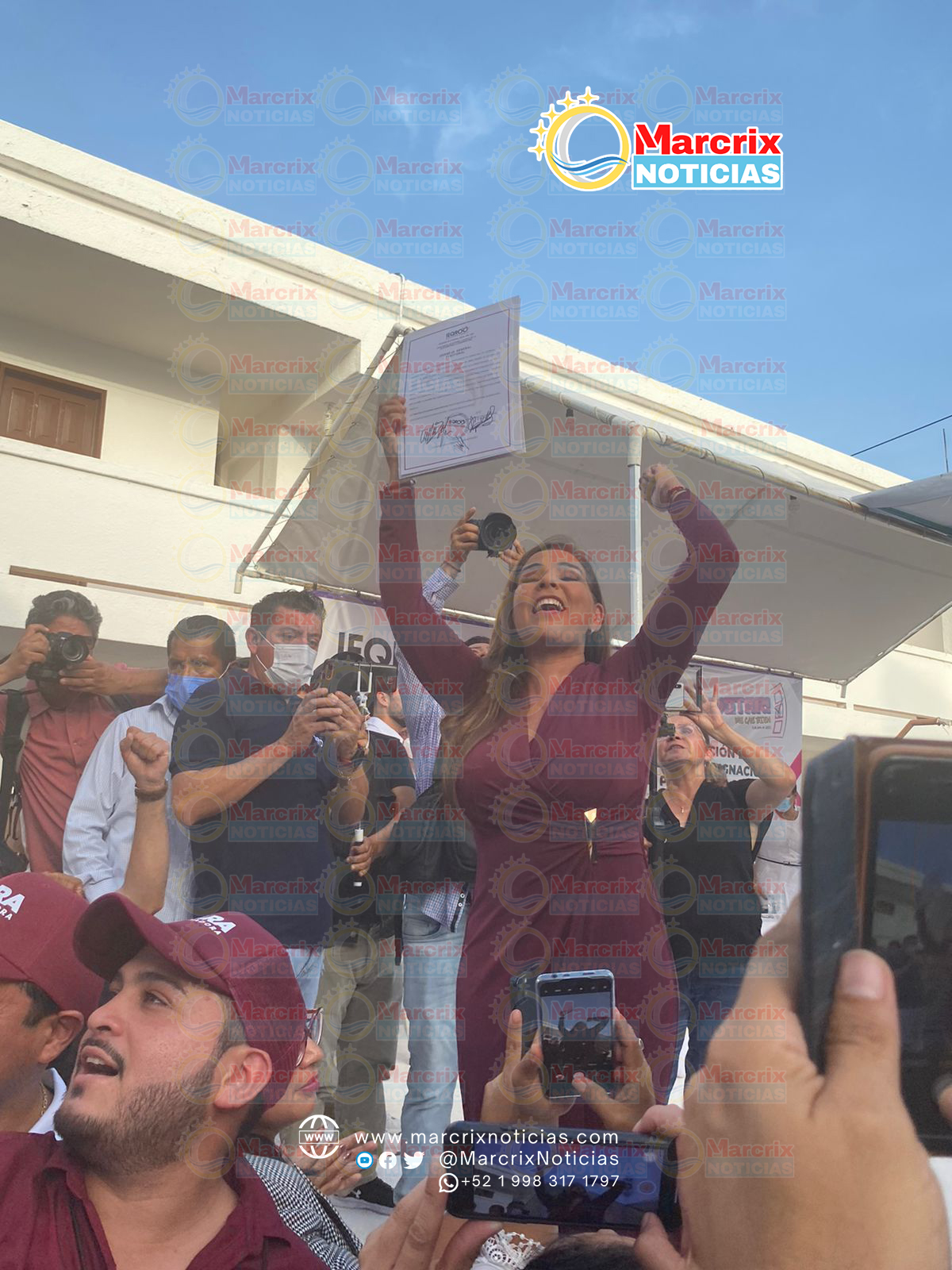 Tras recibir su constancia, Mara Lezama dio un mensaje a los cientos de simpatizantes que la esperaban a fuera de las instalaciones del IEQROO.