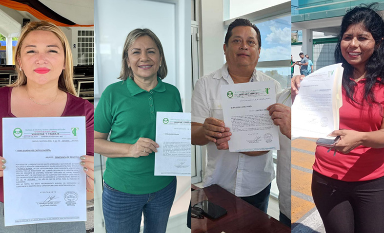 Recibieron la constancia Ruth Salazar Ceballos, como candidata de la “Planilla Verde”, Erika Castillo de la “Planilla Guinda”, Alejandra Aguilar de la “Planilla Roja” y Rubén Carrillo de la “Planilla Blanca”.