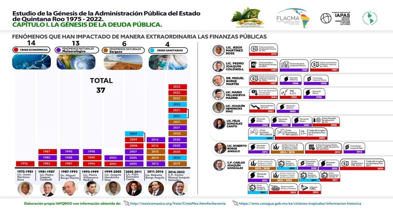 Dicho estudio detalla que desde el gobierno de Jesús Martínez Ross (1975-1981) al actual de Carlos Joaquín (  2016-2022), han impactado de manera extraordinaria las finanzas públicas de Quintana Roo 14 crisis económicas, 13 fenómenos naturales (meteorológicos), 6 fenómenos naturales (sargazo) y 4 de crisis sanitaria.