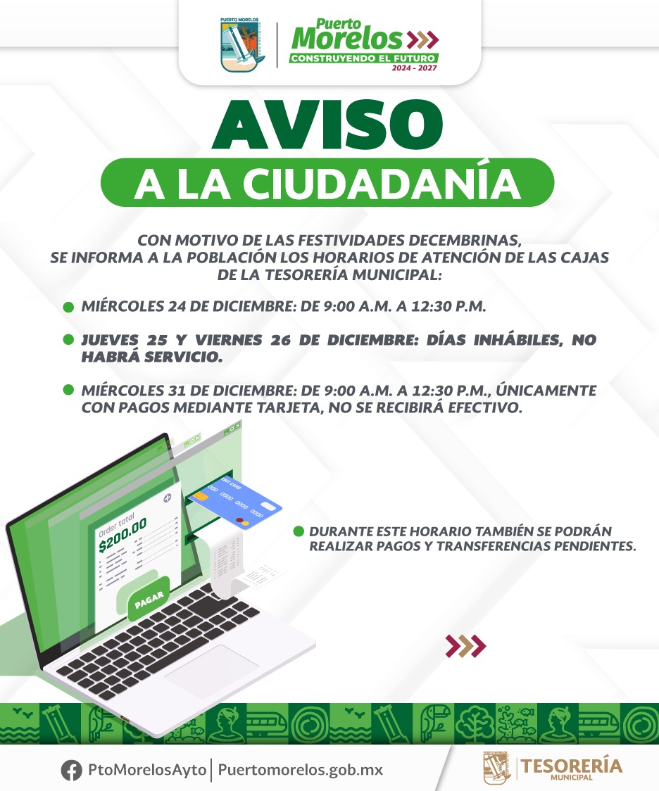 Puerto Morelos (Marcrix Noticias).— Con el objetivo de mantener una imagen limpia y ordenada del destino, así como garantizar la salud pública y el bienestar de la ciudadanía, la presidenta municipal Blanca Merari Tziu Muñoz informó que el servicio de recolección de basura no se suspenderá durante los días 24, 25 y 31 de diciembre, así como el 1 de enero, aunque se realizarán ajustes en los horarios de operación.