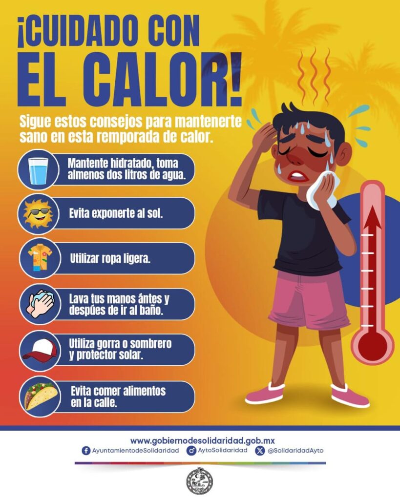 Playa de Carmen, Solidaridad, (MARCRIX Noticias), a 25 de marzo del 2024.- En esta temporada, el golpe de calor es uno de los daños a la salud a los que está expuesta la población, principalmente niños y adultos mayores, por la exposición prolongada a altas temperaturas, por lo que la Secretaría de Salud de Solidaridad emite algunas recomendaciones para mantenerse prevenido.