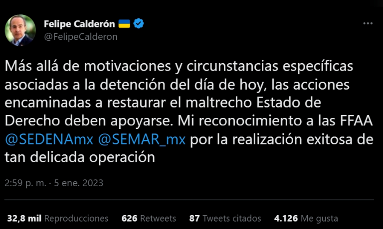 Por medio de su cuenta oficial de Twitter, el ex presidente de México emitió un mensaje en donde reconoció el trabajo de las Fuerzas Armadas para la detención de Ovidio Guzmán.