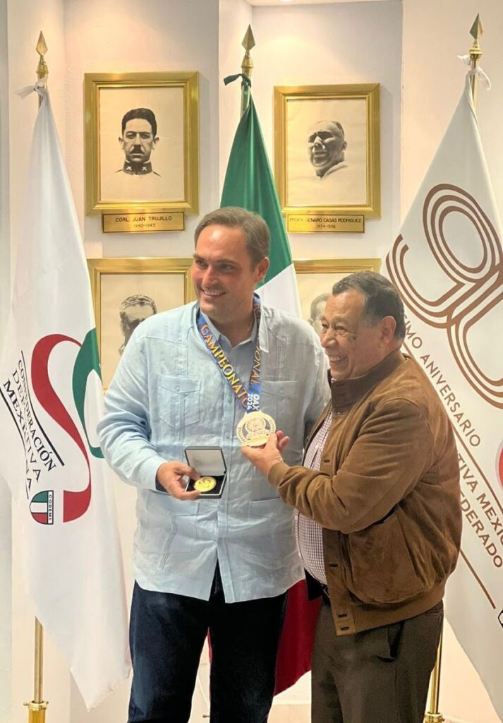 Amador Gutiérrez recibió de manera simbólica de manos del presidente, Francisco Cabezas, una medalla conmemorativa de la institución, así como de parte de la Federación Mexicana de Fisicoconstrutivismo y Fitness otra presea de campeón nacional.