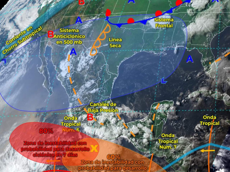 La onda tropical número 7 sobre el Golfo de Tehuantepec y las costas de Chiapas y Oaxaca, interaccionará con un canal de baja presión en el sureste del país y con el ingreso de humedad del Océano Pacífico, Golfo de México y Mar Caribe, ocasionando lluvias fuertes a muy fuertes acompañadas de descargas eléctricas y rachas de viento.