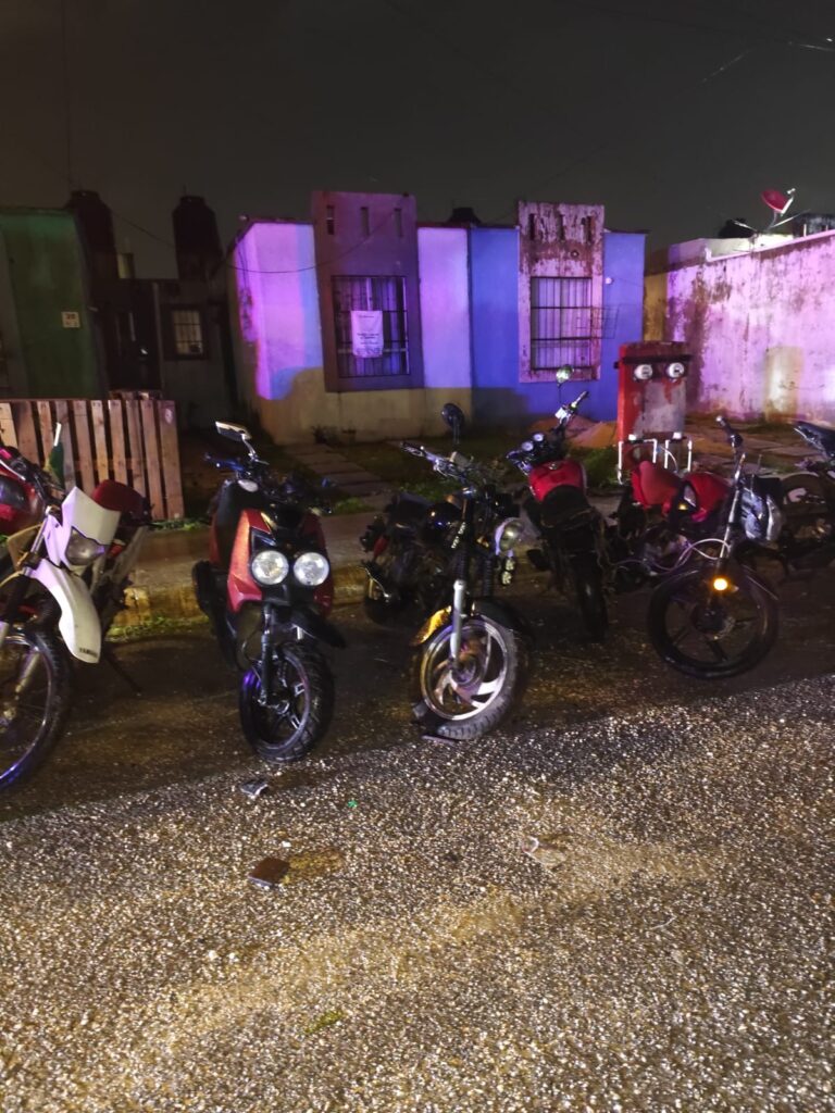 La diligencia tuvo lugar en un predio ubicado en la avenida 20 de Noviembre y calle Palma Africana de la Supermanzana 259, donde agentes de la Policía de Investigación adscritos a la Fiscalía Especializada en Combate a Robo de Vehículos y Transporte, aseguraron dos motocicletas y dos cuadros pertenecientes a motocicletas con reporte de robo en la entidad.