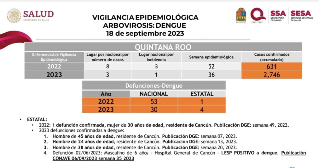 Cancún (Marcrix Noticias).- El estado de Quintana Roo está entre los líderes a nacional en casos de dengue y muertes, al registrar 4, en este año, informaron autoridades de la Secretaría de Salud.