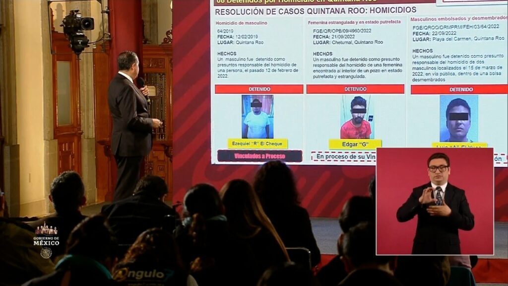 Así también, Mejía Berdeja resaltó la detención de ocho presuntos responsables de homicidios dolosos con arma de fuego en Cancún, Tulum, Puerto Morelos, Chetumal y Playa del Carmen; cinco de ellos ya se encuentran vinculados a proceso penal.